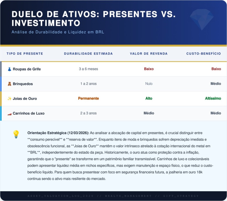 Diferente de roupas de marca ou brinquedos eletrônicos que perdem o valor comercial imediatamente após o uso, o ouro é uma moeda global de aceitação universal. Em momentos de instabilidade econômica, possuir um ativo físico garante que aquele presente possa, em um futuro distante, ser convertido em recursos para estudos ou outras necessidades urgentes, preservando o poder de compra investido inicialmente em R$.