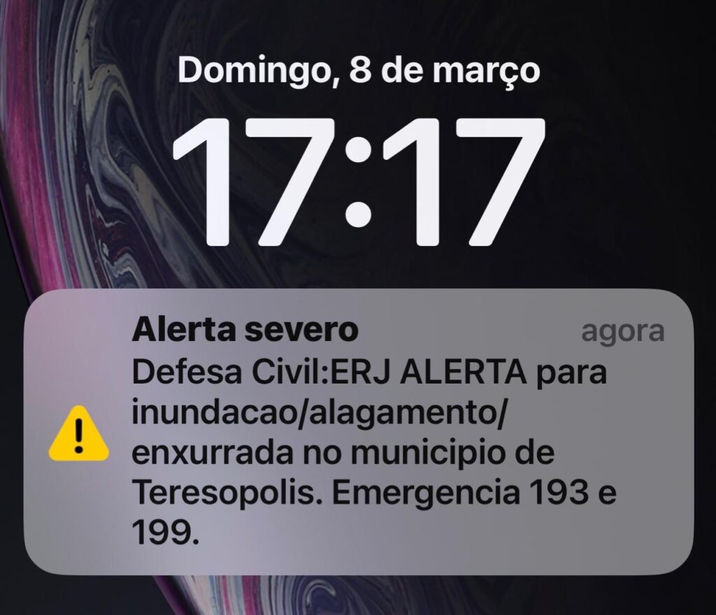 A Defesa Civil de Teresópolis também enviou alertas diretamente para os telefones celulares da população por meio do sistema Cell Broadcast. A mensagem classificada como alerta severo foi disparada às 17h17, informando sobre risco de inundações, alagamentos e enxurradas.